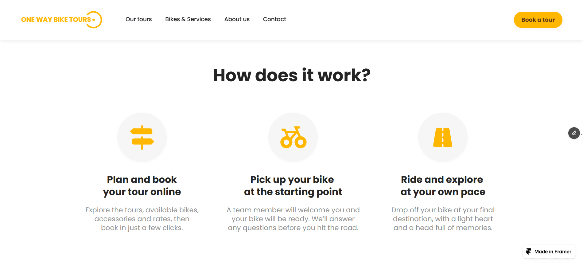 Het kleine fietsverhuurbedrijf One Way Bike Tours had een probleem: klanten konden op de website niet goed vinden welke informatie ze nodig hadden en vonden de aangeboden dienst onduidelijk. Het bedrijf positioneert zich liever als een aanbieder van avontuurlijke fietstours dan als een gewone fietsverhuurder. De zwakke communicatie van hun website zorgt voor veel vragen rondom de dienst van One Way Bike Tours. Dit zorgde voor klantverlies en een onnodige drukke klantenservice, die ze nauwelijks kunnen onderhouden.