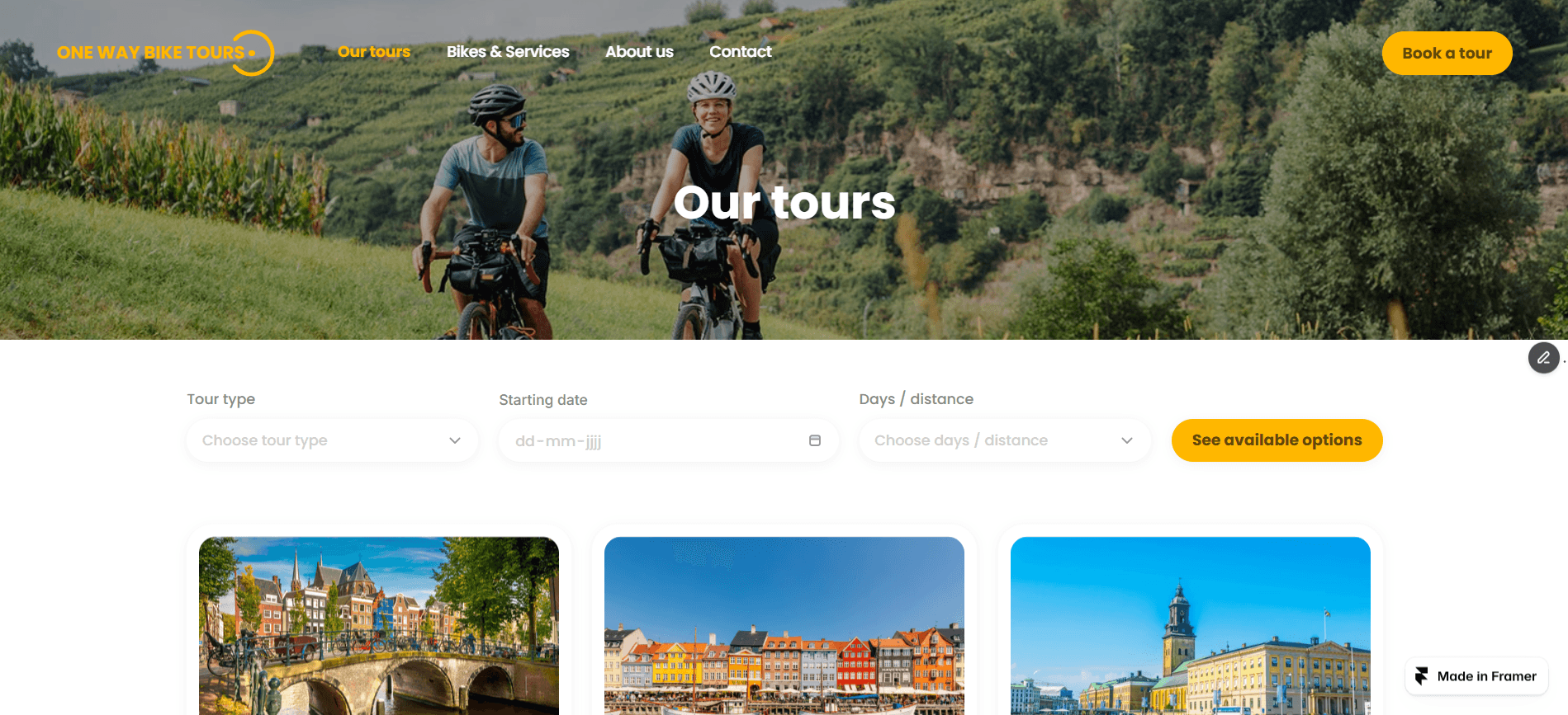 Ik en mijn team kregen de taak om een nieuwe website te maken voor One Way Bike Tours. Door middel van de design sprint methode werkte ik twee weken aan sketches, userflows en een prototype in Figma. Dit prototype heb ik uiteindelijk omgezet tot een echte website in Framer. In mijn rol als Design Lead nam ik de leiding over visual en UX designbeslissingen, terwijl ik het team ondersteunde met feedback en tips over Figma en Framer.