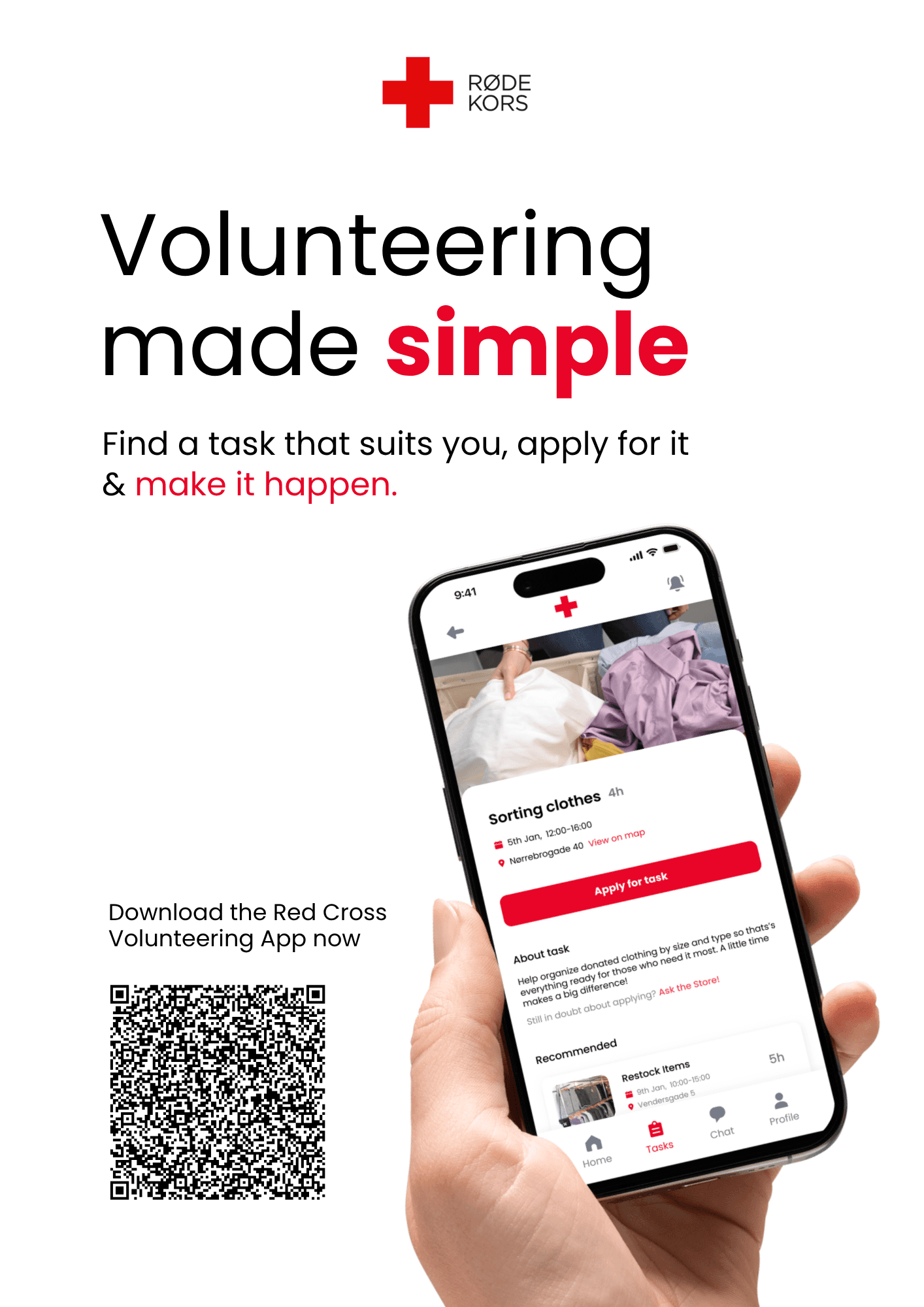 Het Deense Rode Kruis was op zoek naar een digitaal product dat het makkelijker maakt voor jongeren om vrijwilligerswerk te doen. Het doel was om senior vrijwilligers van de Rode Kruis winkels in staat te stellen specifieke taken aan te maken, zodat jongeren niet meteen volledig vrijwilligerswerk hoeven te doen, maar ook kortdurende taken van bijvoorbeeld drie uur kunnen uitvoeren.