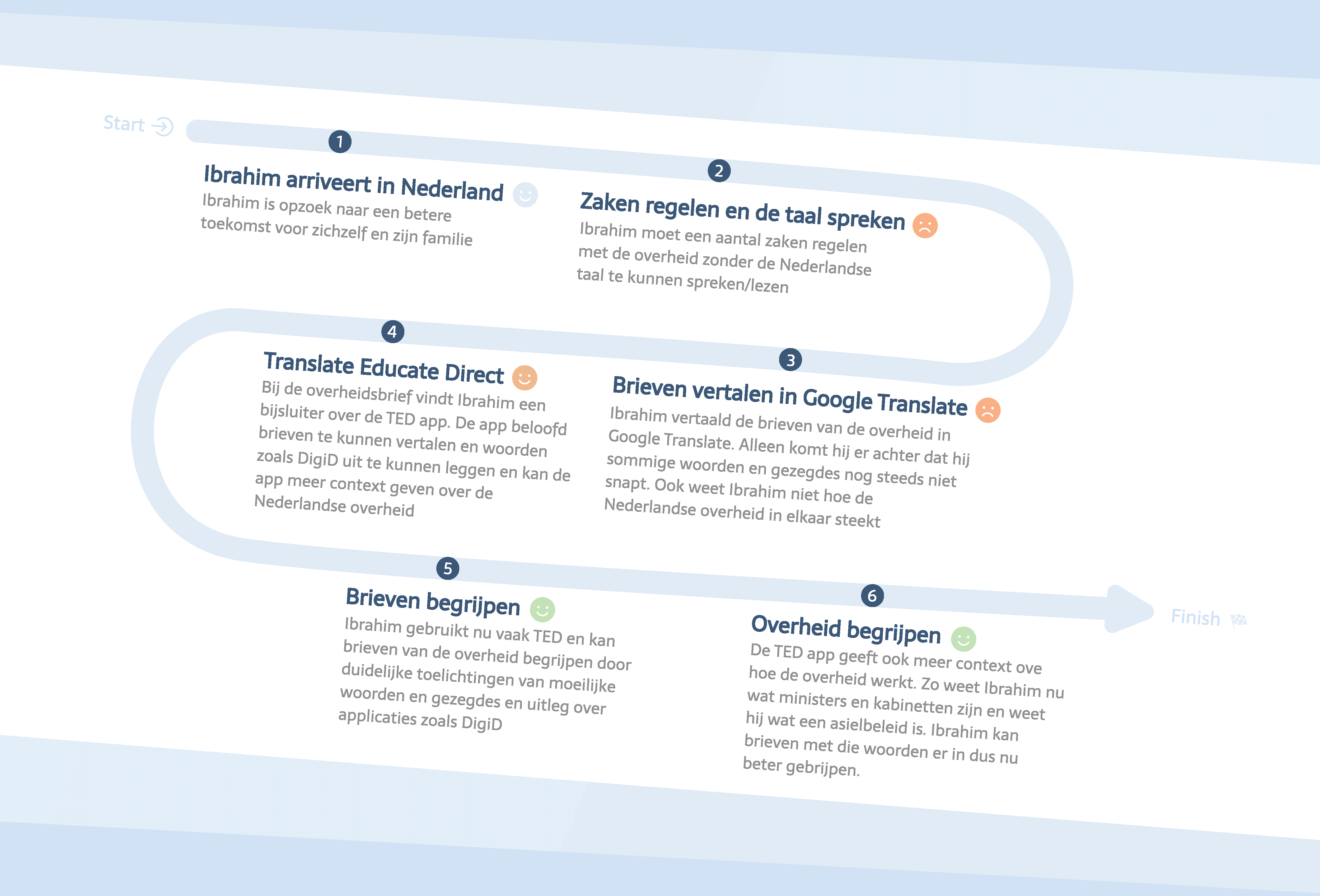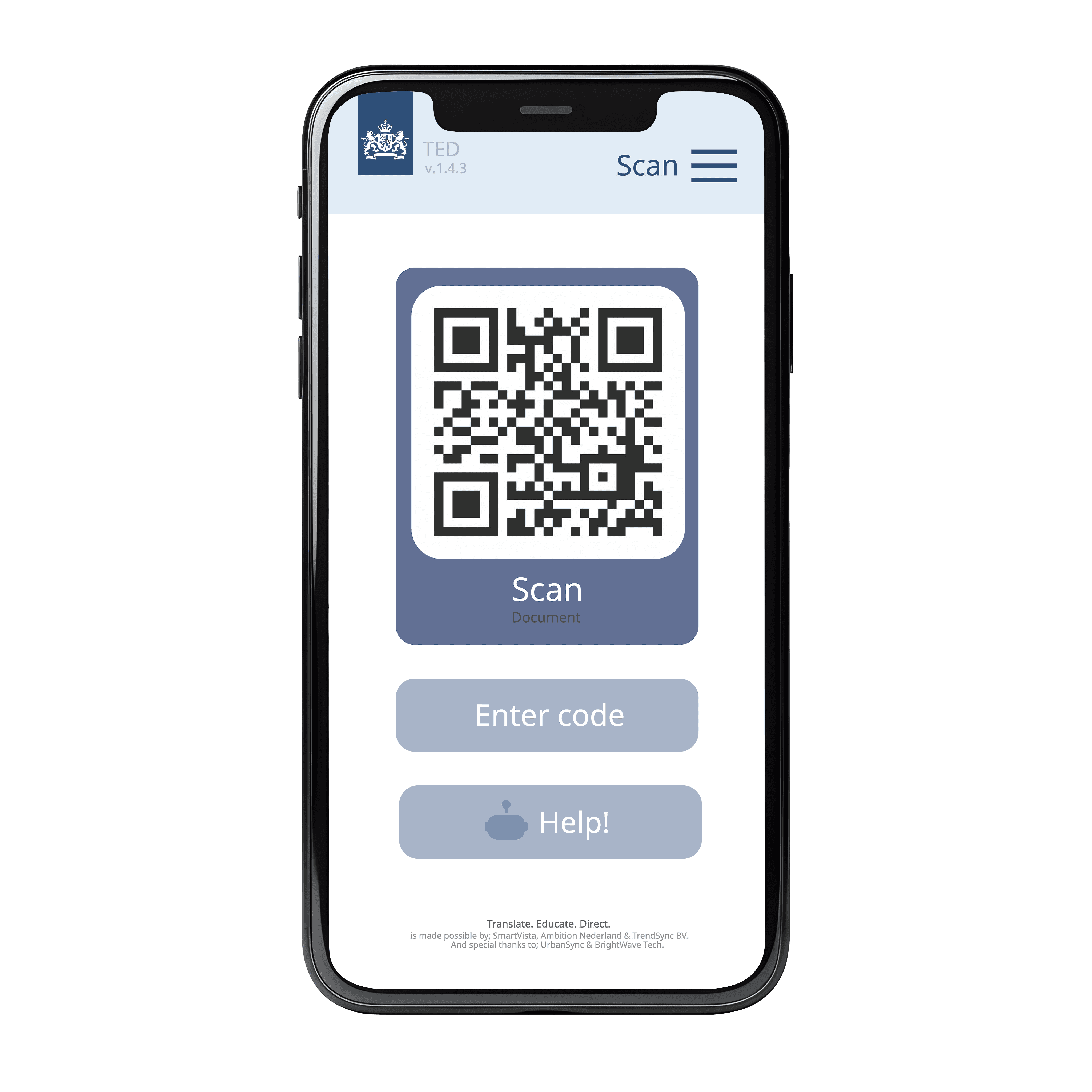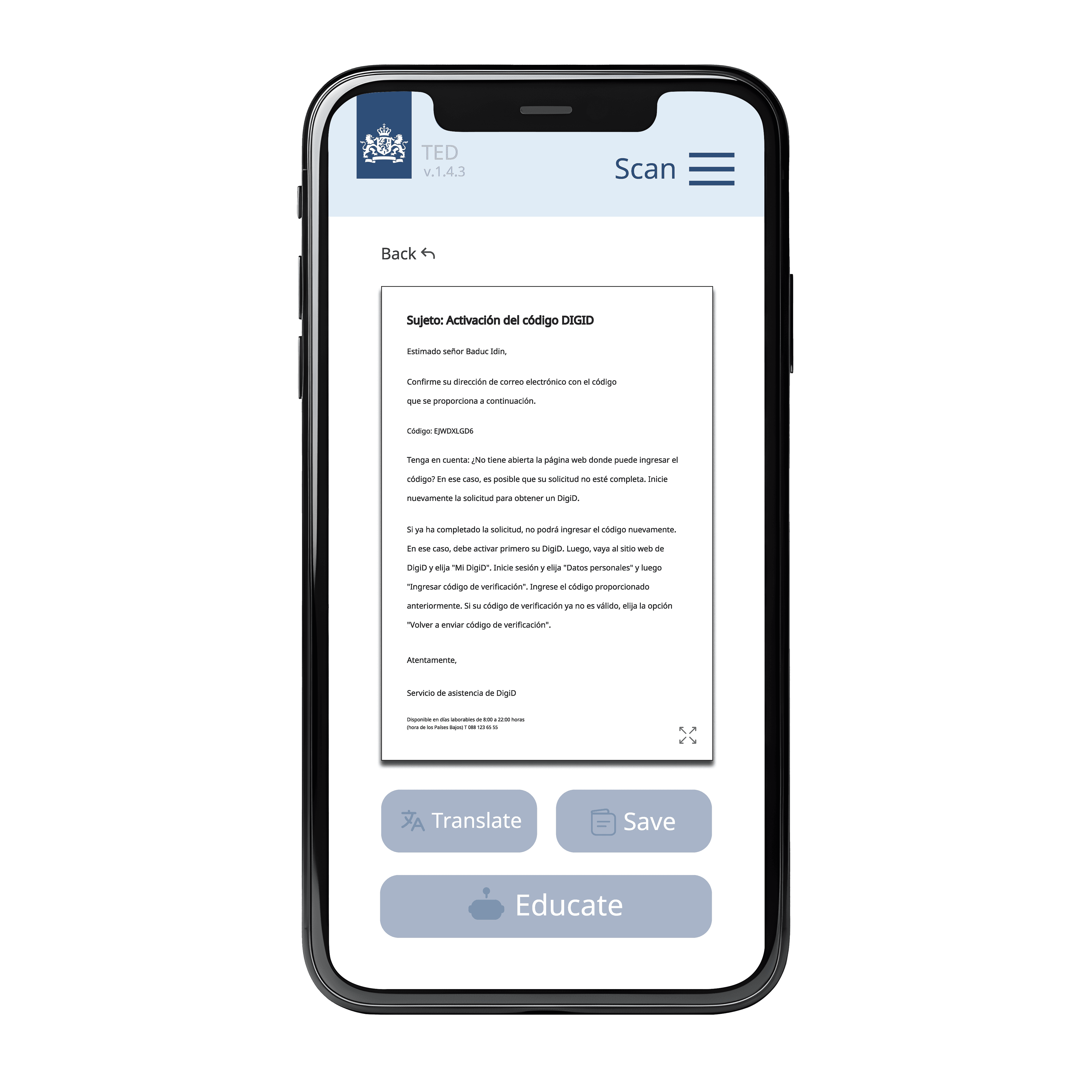 Translate Educate Direct is een app gemaakt voor migranten en bied een makkelijke oplossing voor het lezen en begrijpen van overheidsbrieven. In de app wordt je geholpen door een taalbot genaamd TED die je ondersteund bij het lezen en/of uitleggen van de tekst op een brief. Als een migrant een overheidsbrief ontvangt krijgt hij er een extra bijsluiter bij met uitleg over de TED app en een qr code. In de app kan je die qr code scannnen om de brief digitaal in te laden.