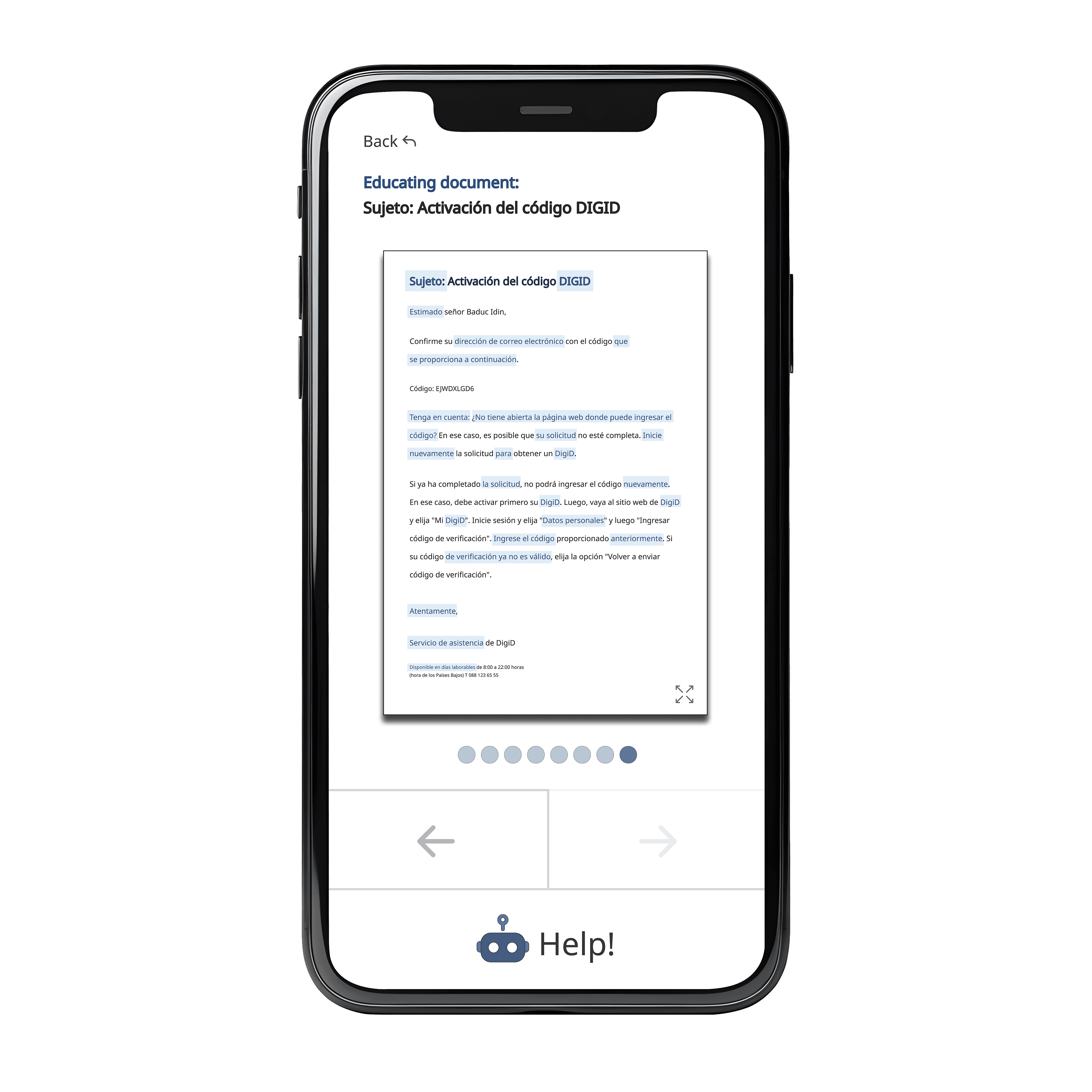 Doormiddel van gebruikerservaringen op eerdere iteraties heb ik de app vormgegeven. Op elk scherm heb ik gebruikt gemaakt van een visuele hiërarchie. De taal van de overheidsbrieven zijn in het Spaans om de kijker van het prototype in de schoenen te zetten van de mirgant: een paar woorden zijn herkenbaar maar je kan de brief niet lezen.