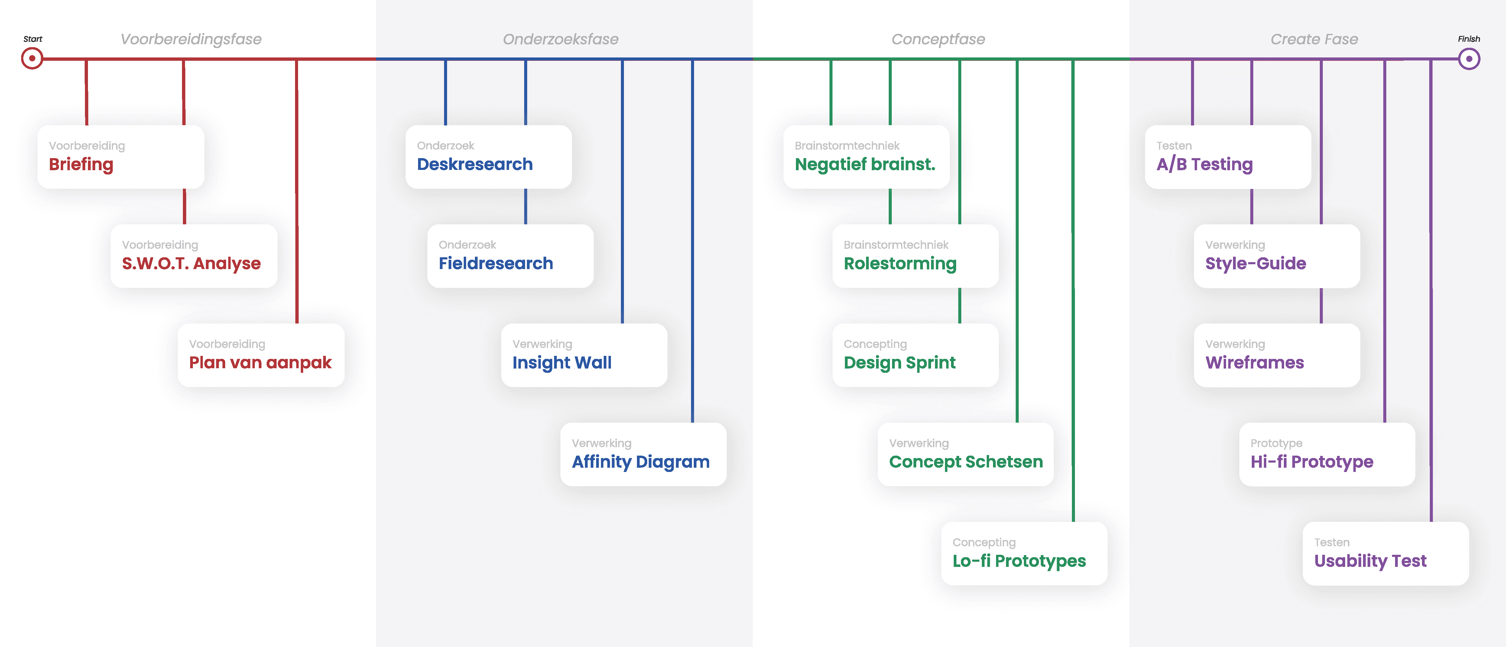 Om de ICTU te voorzien van een digitaal ontwerpelement heb ik verschillende design fases moeten doorlopen. Op de ontwerpproceskaart is te zien welke onderzoeken, creatieve technieken en ontwerpmethodes zijn uitgevoerd die uiteindelijk hebben geleid tot het eindproduct.